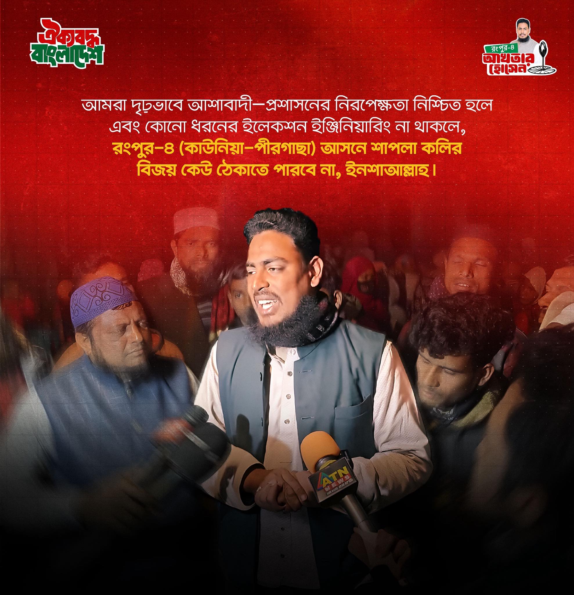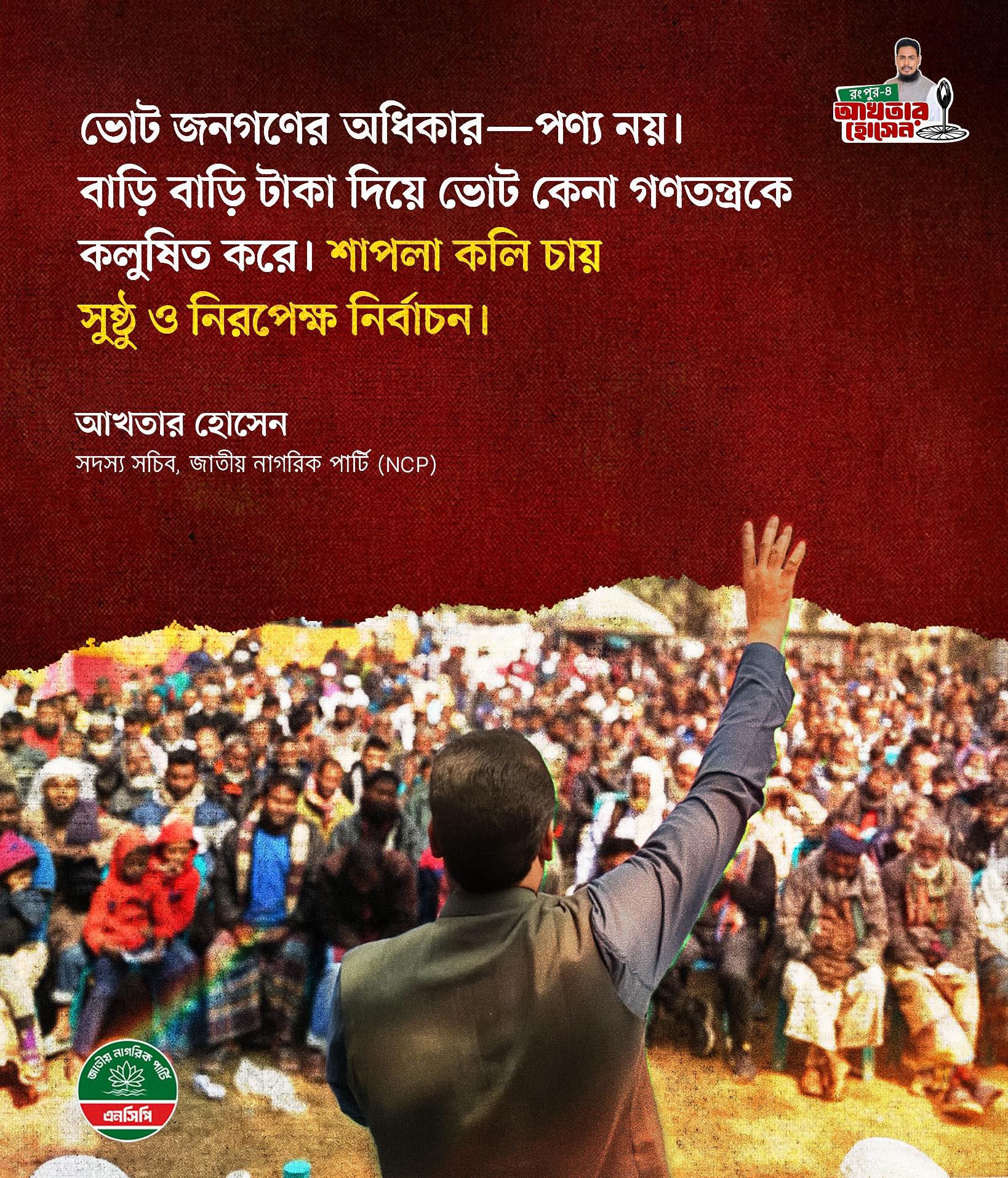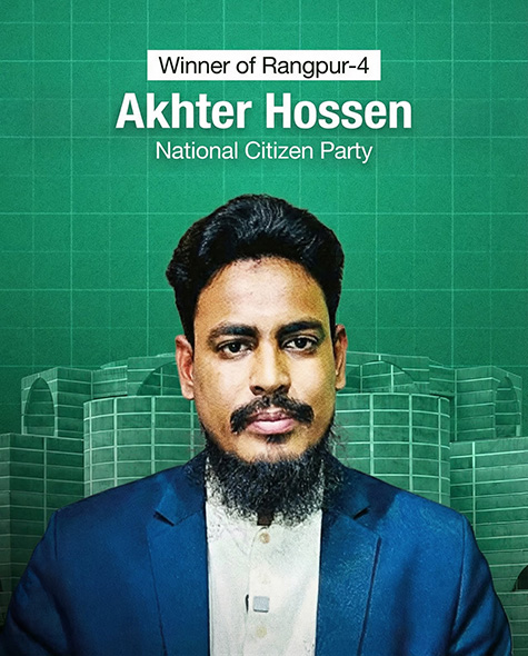 ত্রয়োদশ জাতীয় সংসদ নির্বাচনে রংপুর-৪ আসনে জাতীয় নাগরিক পার্টি (এনসিপি) মনোনীত প্রার্থী আখতার হোসেন শাপলা কলি প্রতীকে ১ লাখ ৪৯ হাজার ৯৬৬ ভোট পেয়ে নির্বাচিত হয়েছেন।