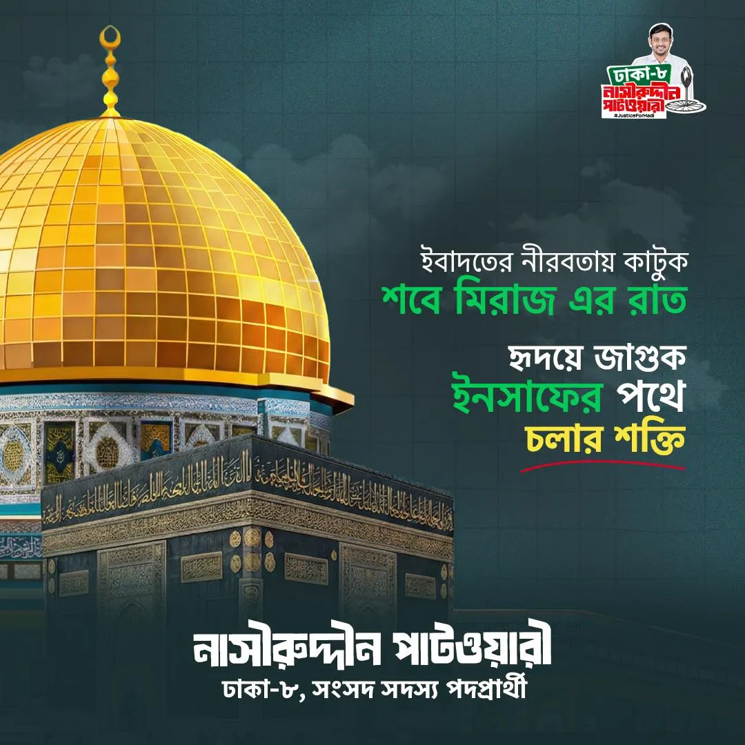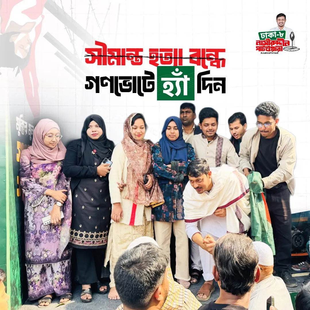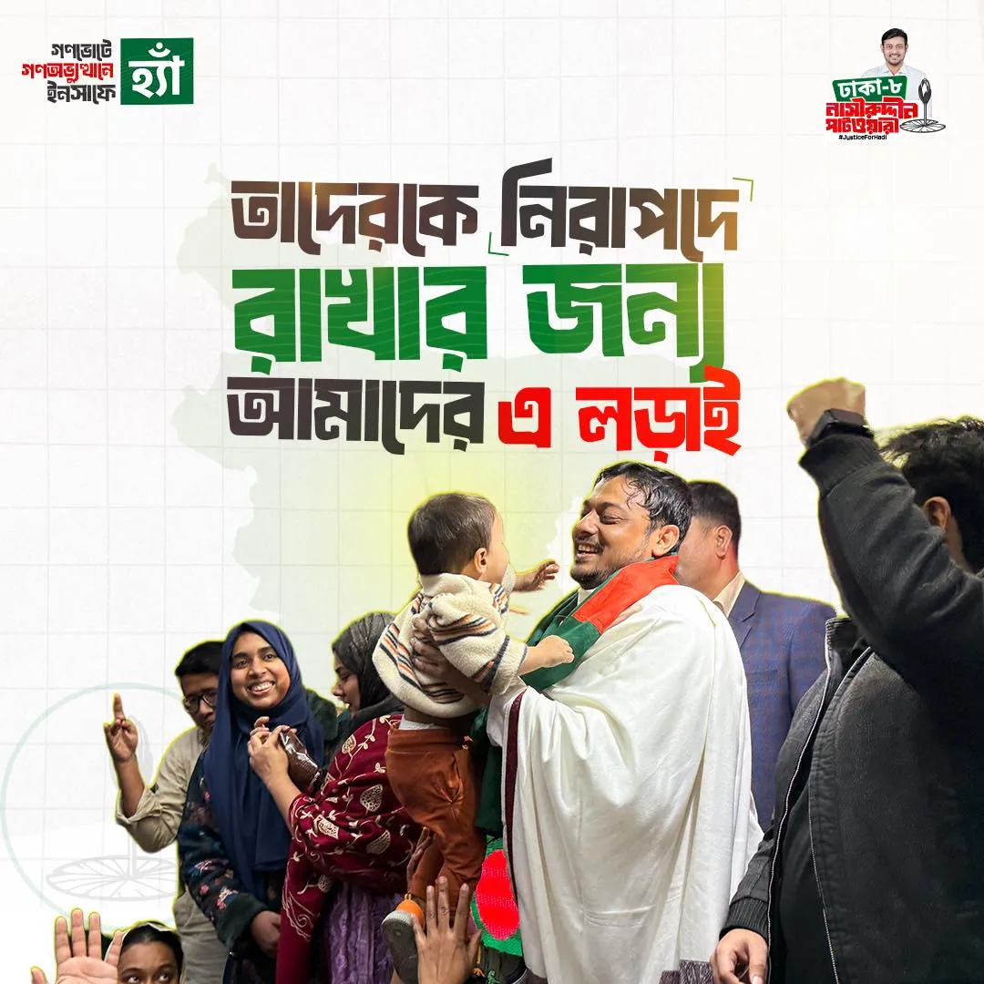 আমি নাসীরুদ্দীন পাটওয়ারী আগামী জাতীয় সংসদ নির্বাচনে ১১ দলীয় জোটের হয়ে এনসিপি এর পক্ষ থেকে ঢাকা-০৮ আসনে প্রতিদ্বন্দ্বিতা করছি।